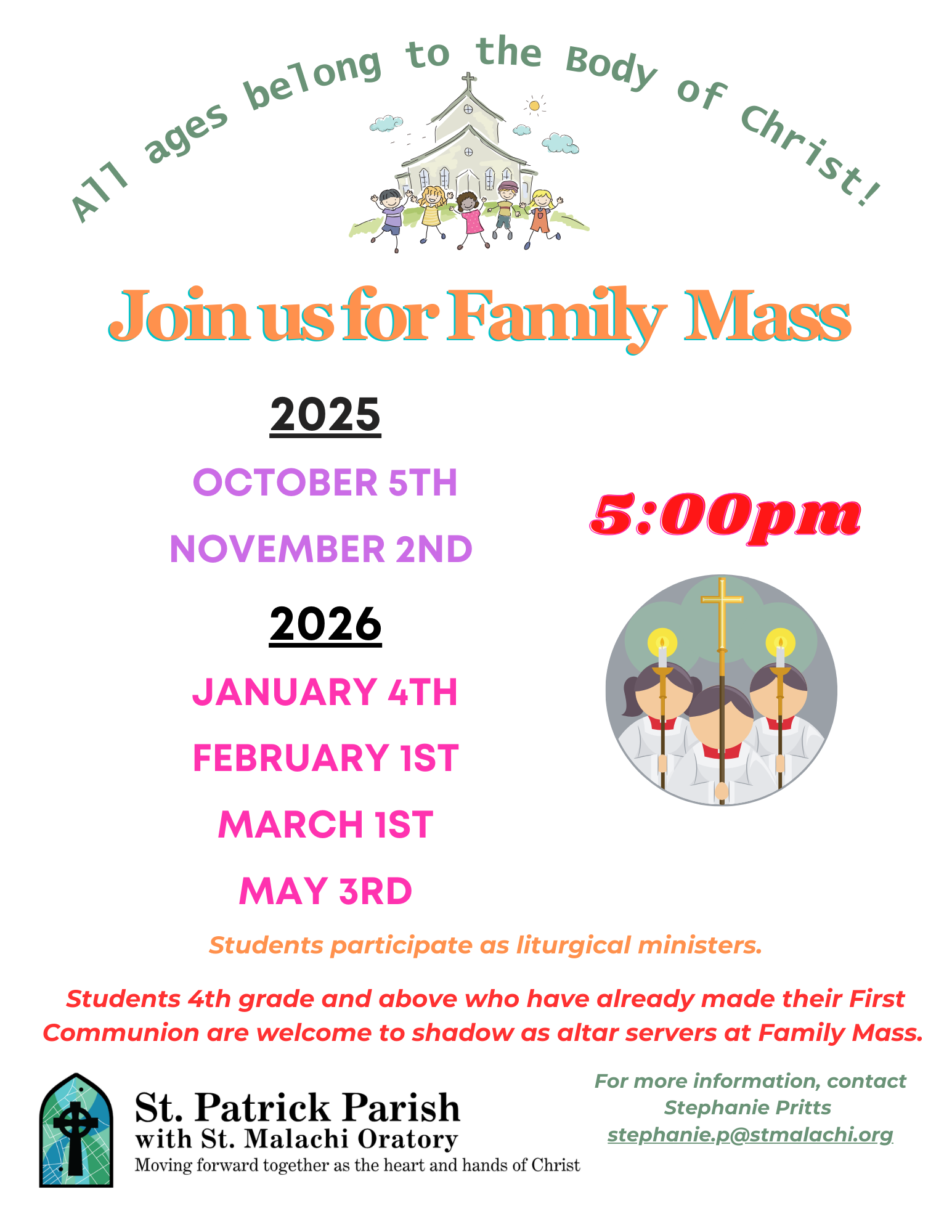 If you have questions about Parish School of Religion, please contact Stephanie Pritts at stephanie.p@stmalachi.org or call 216-631-0267 (St. Patrick).